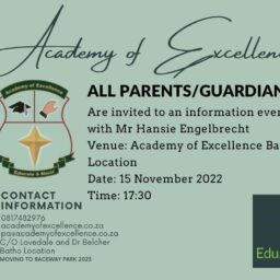 Latest News 18 September 2025Growing Knowledge – Academy of Excellence’s Agricultural FacilityRead more 17 May 2024Vacancy: AOE – Primary School BursarRead more 24 October 2023Term 4 CircularRead more 8 September 2023We will miss you, Mr. Willie HavengaRead more 17 July 2023A Letter of Encouragement to Principals and ManagementRead more 24 January 2023Congratulations Matrics of 2022!!Read more 12 October 2022Information SessionRead more 21 June 2022New CampusRead more 1 June 2022SAVCA 2022 Private Equity ConferenceRead more 17 May 2022Rewrite Centre: Senior Certificate Time Table June/July 2022Read more 21 January 2022Congratulations Class of 2021Read more 5 January 2022New Years MessageRead more 30 November 2021Letter from the RectorRead more 15 October 2021The end of a school careerRead more